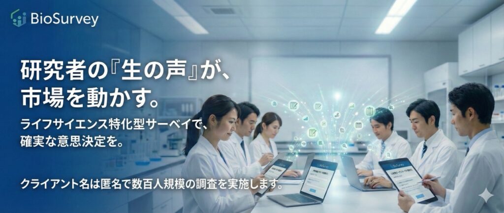 弊社が提供するBioSurveyライフサイエンス研究市場調査サービスは、ライフサイエンス研究者(オピニオンリーダー)数百名にアンケート調査を依頼し、回答を統計的に処理してAI分析することで、貴社の製品開発やマーケティングの指針となる報告書をご提供可能です。